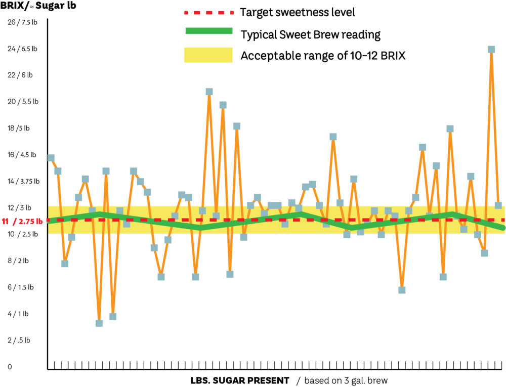 We often perform field data tests for potential clients by blind shopping locations and using a professional tool that measures the BRIX in their sweet tea. We generally find readings like these that are a clear indication of inconsistency in following the company ‘recipe.’ When using the Sweet Brew Pouch your readings and efficiencies will dramatically normalize.